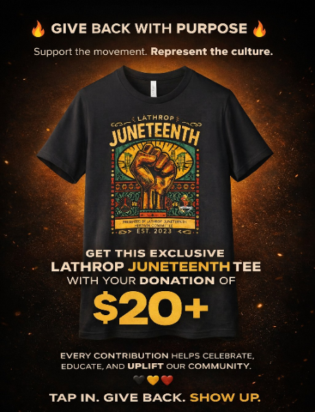 Your generosity helps bring our community together to celebrate freedom, culture, and unity through music, food, and educational experiences. Every contribution makes a meaningful impact in honoring our history and uplifting our community. As a thank you, donations of $20 or more will receive a commemorative Lathrop Juneteenth T‑shirt. To donate fill out the form below, and follow the instructions on the confirmation page.
